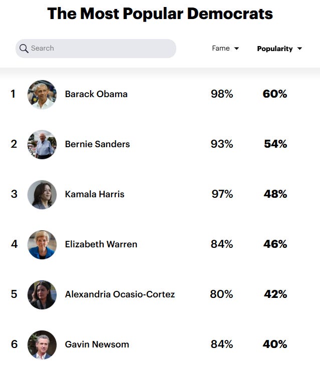 YouGov’s ranking of Democrats by popularity vs. fame paints a far different picture of electability than what gets speculated online or even by professional politicos. After Gavin Newsom, the fame and popularity the 2028 primary field starts to fall dramatically. Big donor money can help raise a profile, but it can’t make a politician more charismatic or seriously elevate an unimpressive record. And even if it could, we’ve already seen what happens when you have a crowded field of middle-weight politicians representing the old political center, and fueled primarily by big money donors.
